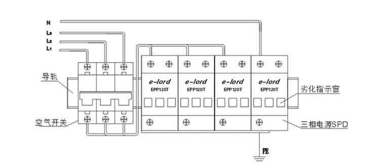 1. 已有可靠接地系統(tǒng),在配電柜(避雷器安裝處)的接地樁 條)上進(jìn)行接地電阻的測(cè)定,電阻應(yīng)符合相關(guān)規(guī)范要求。 (或滿足國(guó)家、部級(jí)標(biāo)準(zhǔn))。 2. 配電柜中應(yīng)留有安裝避雷器的空間, 注:L為電源相線;N為電源零線;PE為地線。 | 應(yīng)檢查空氣開關(guān)已經(jīng)合閘導(dǎo)通,以保證避雷器處于運(yùn)行狀態(tài); 不要在雷雨天安裝。 |