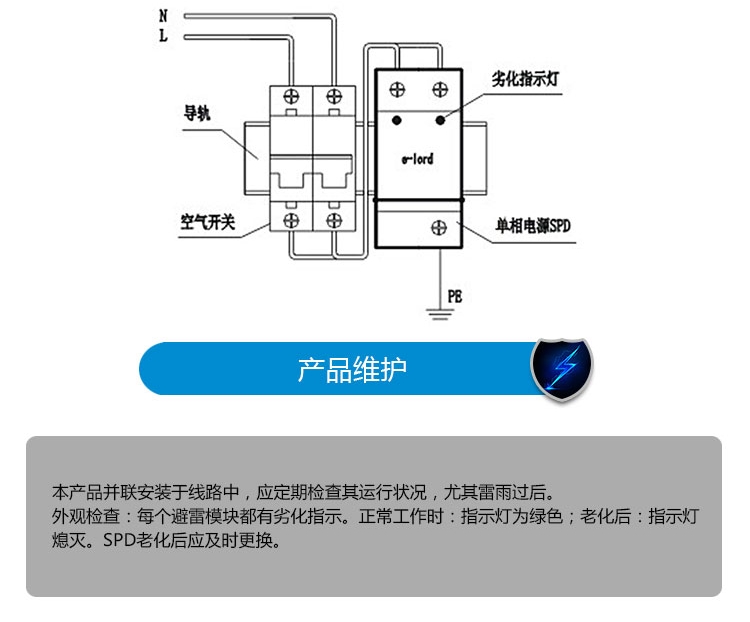 1. 已有可靠接地系統(tǒng),在配電柜(避雷器安裝處)的接地樁 (條)上進行接地電阻的測定,電阻應(yīng)符合相關(guān)規(guī)范要求。 (或滿足國家、部級標準)。 2. 配電柜中應(yīng)留有安裝避雷器的空間, 注:L為電源相線;N為電源零線;PE為地線。 | 應(yīng)檢查空氣開關(guān)已經(jīng)合閘導通,以保證避雷器處于運行狀態(tài); 不要在雷雨天安裝。 |