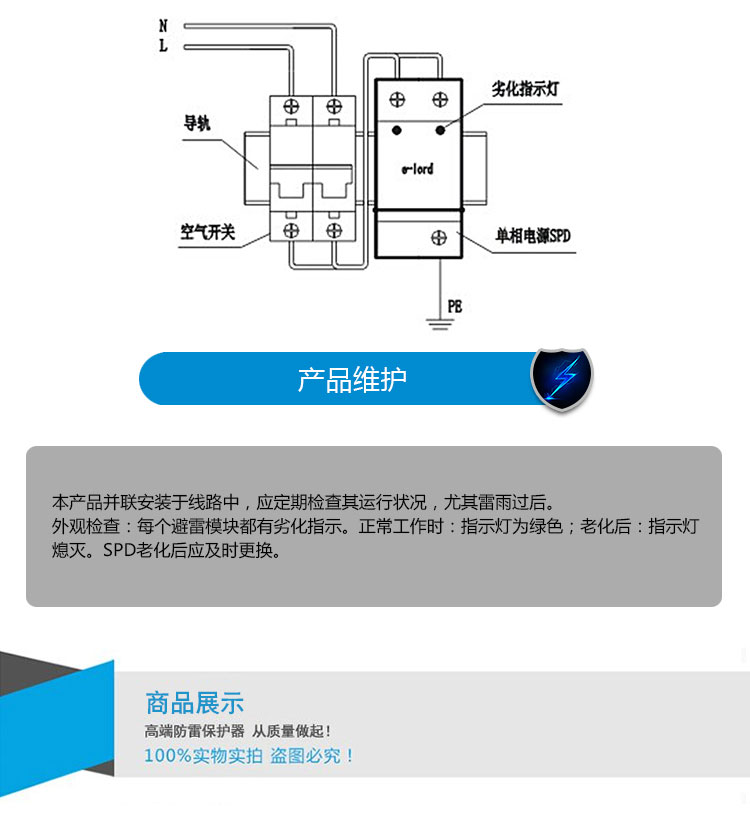 1. 已有可靠接地系統(tǒng),在配電柜(避雷器安裝處)的接地樁 (條)上進行接地電阻的測定,電阻應(yīng)符合相關(guān)規(guī)范要求。 (或滿足國家、部級標(biāo)準(zhǔn))。 2. 配電柜中應(yīng)留有安裝避雷器的空間, 注:L為電源相線;N為電源零線;PE為地線。 | 應(yīng)檢查空氣開關(guān)已經(jīng)合閘導(dǎo)通,以保證避雷器處于運行狀態(tài); 不要在雷雨天安裝。 |